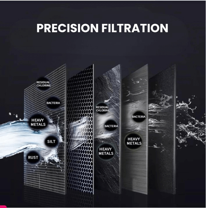 Unser Filter entfernt effektiv Chlor, Kalk, Bakterien und andere Verunreinigungen, sodass du jederzeit frisches und reines Wasser genießen kannst.